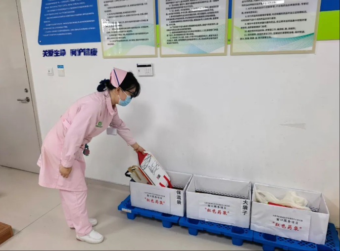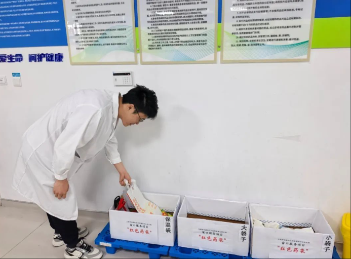 党员们更是化身“袋袋管家”,利用午休时间,对收集来的包装袋进行清洗、消毒、分类整理,并根据大小、功能进行标注和存放。印着咖啡拉花的牛皮纸袋用于装心脑血管药物,保温编织袋专门存放需冷藏的药品,卡通外卖袋则成为儿童药品的专属“快乐礼包”。