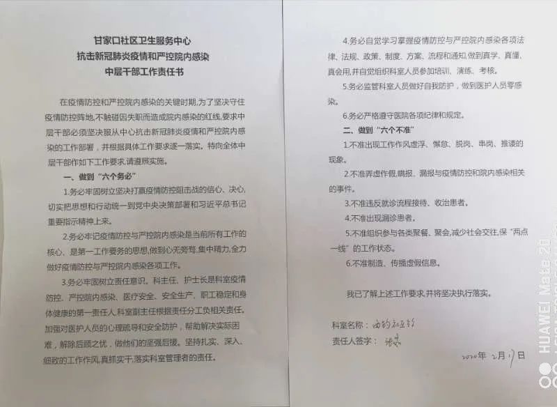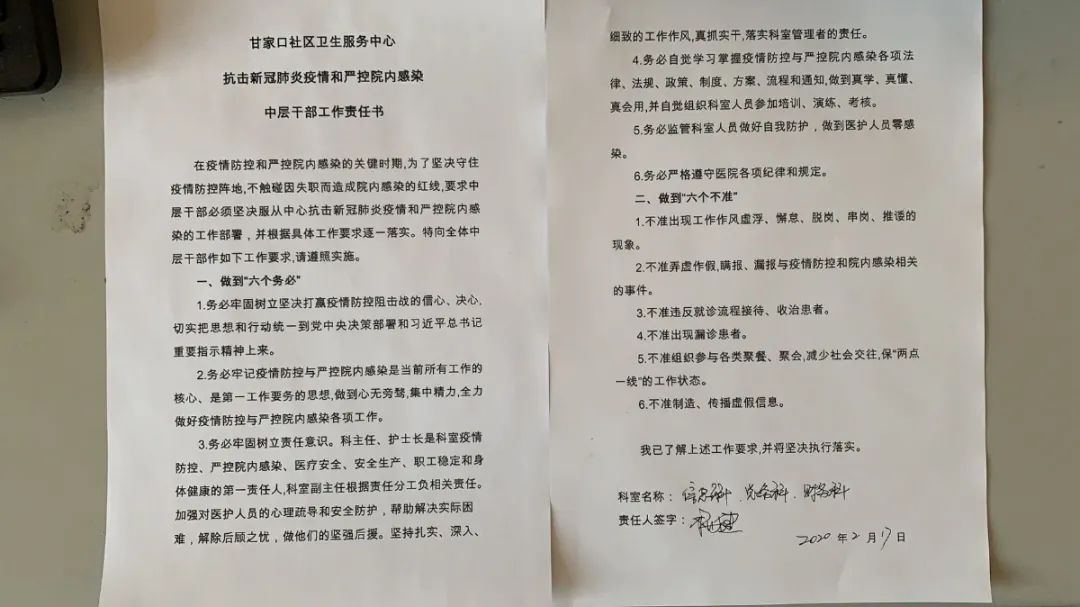 中心班子成员、中层干部及科室人员分别签订疫情防控责任书。落实层级制管理,坚决服从中心抗击新冠肺炎疫情和严控院内感染的工作部署,并根据具体工作要求逐一落实。