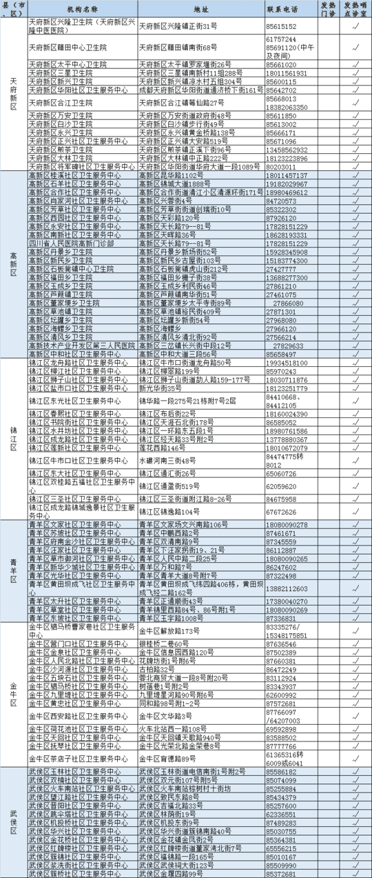 目前,成都市二级以上医院设有发热门诊102家;全市392家社区卫生服务中心和乡镇卫生院发热哨点诊室(发热门诊)已实现全覆盖,其中5家为发热门诊,其余387家社区卫生服务中心和乡镇卫生院按照要求设置为发热哨点诊室。