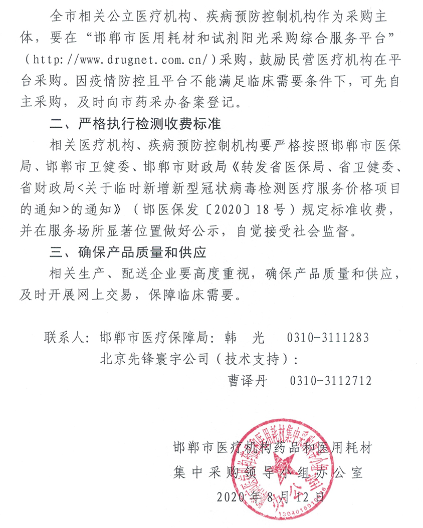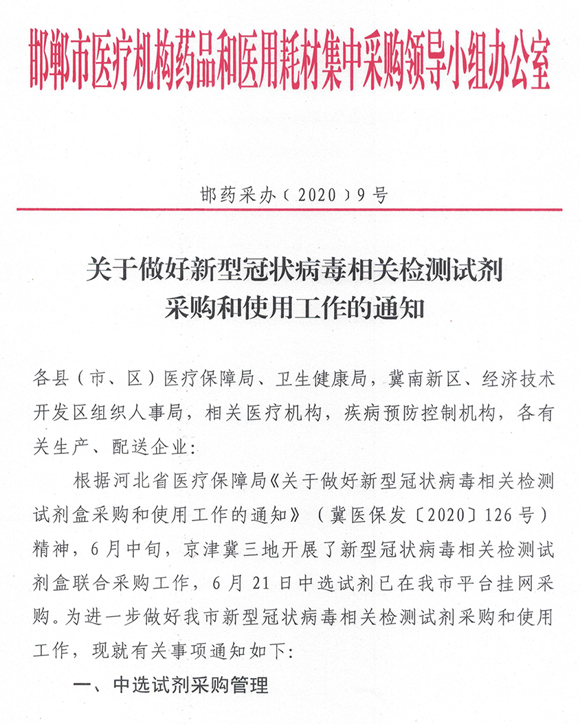 邯郸:关于做好新型冠状病毒相关检测试剂采购和使用工作的通知
