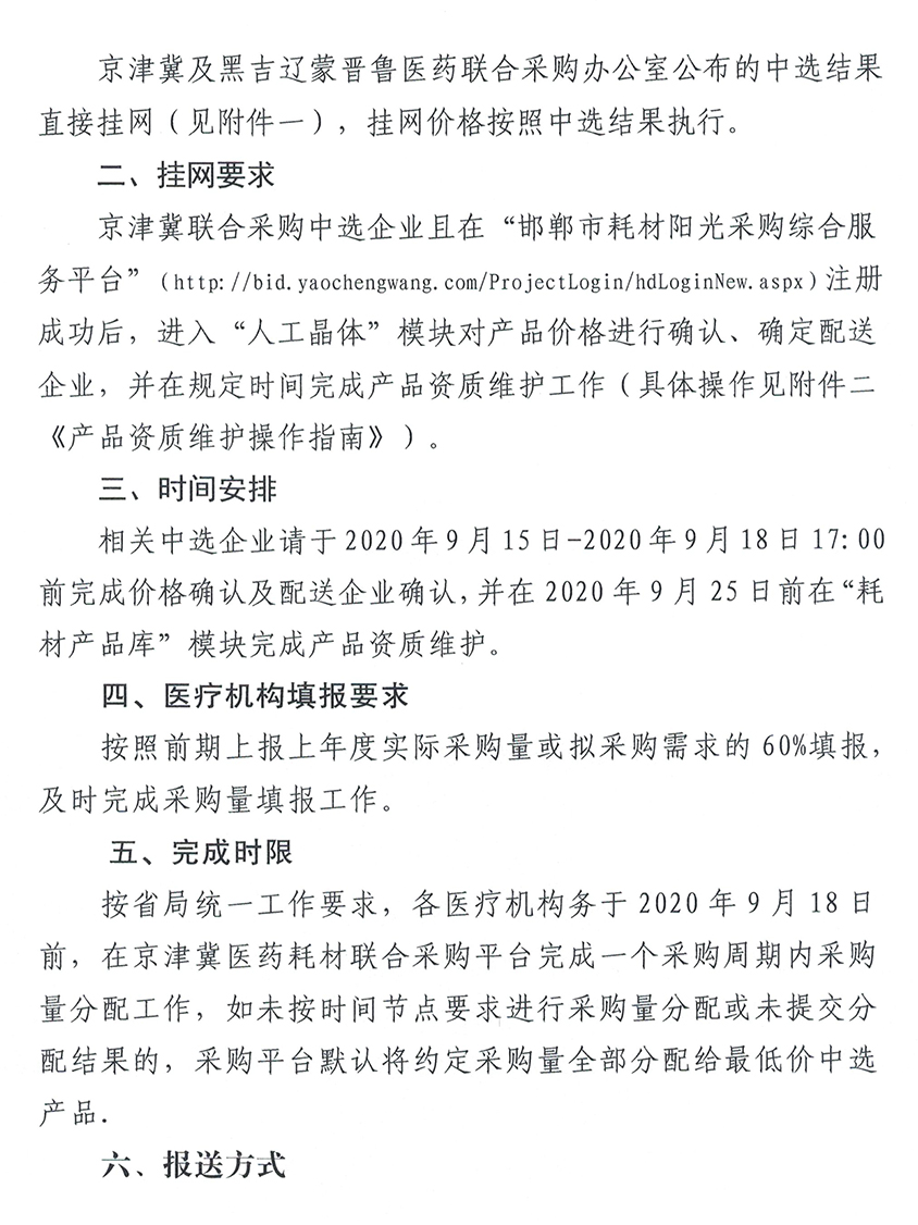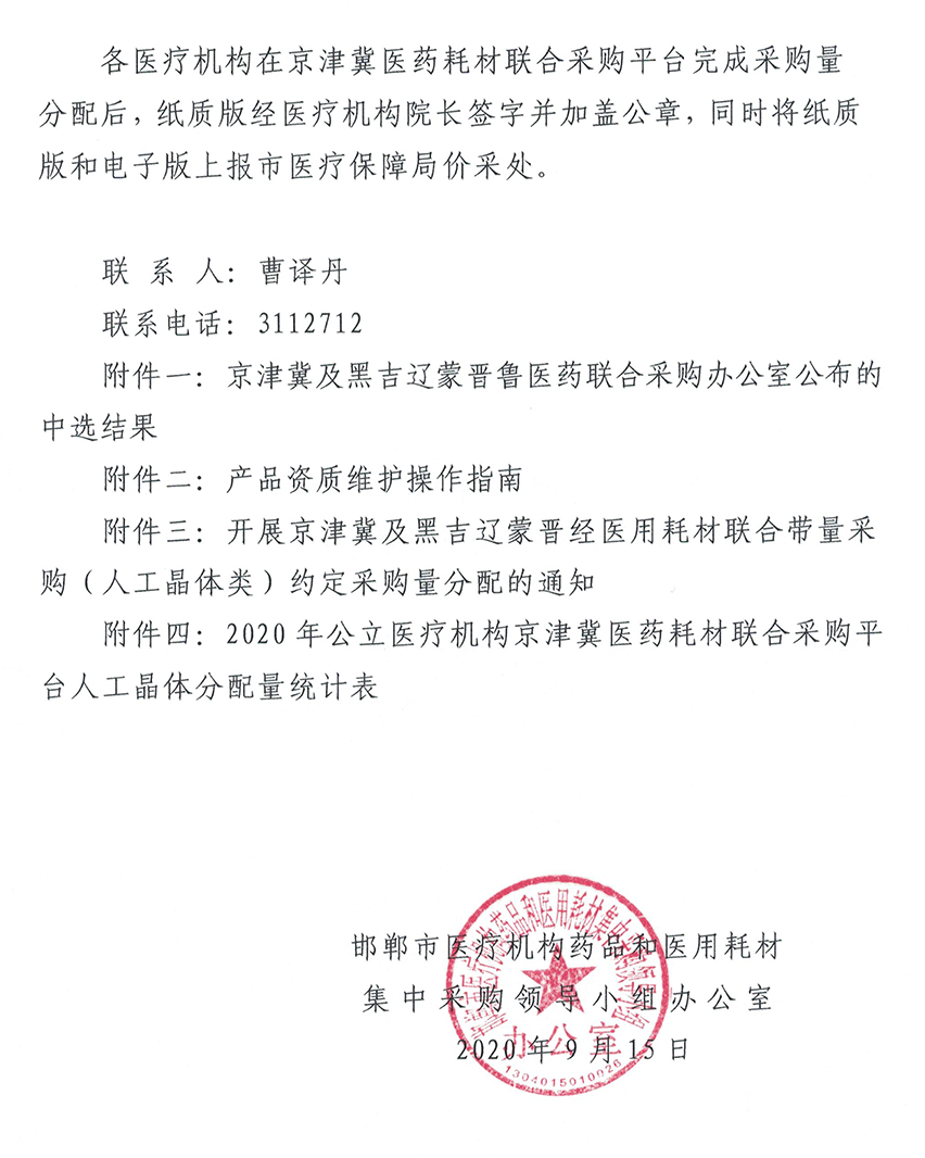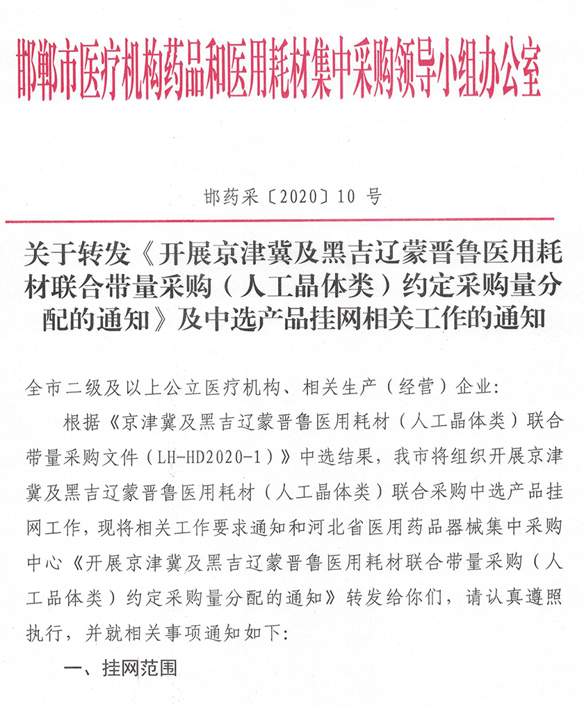 邯郸:关于转发《开展京津冀及黑吉辽蒙晋鲁医用耗材联合带量采购(人工晶体类)约定采购量分配的通知》及中选产品挂网相关工作的通知