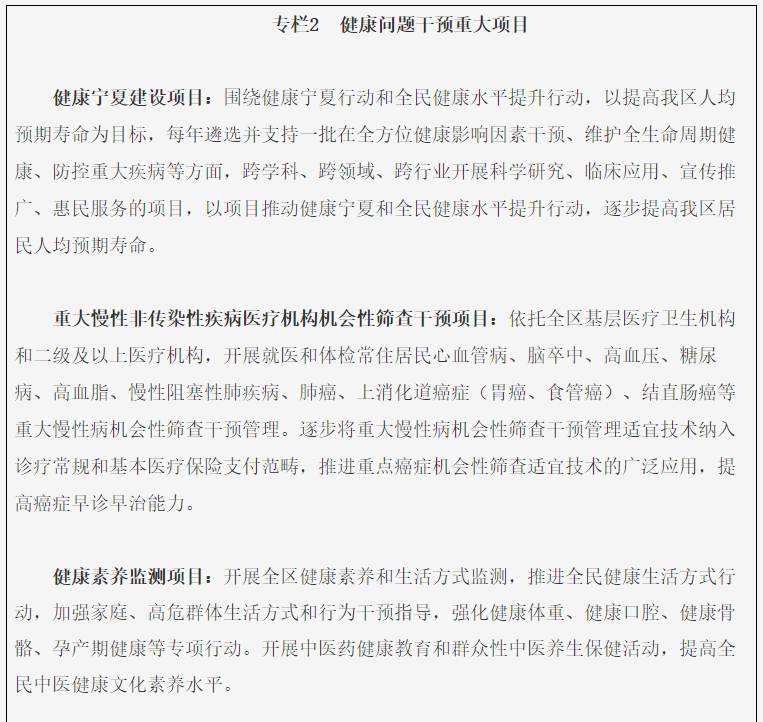 到2025年,基本建成能有效应对重大疫情和突发公共卫生事件、基本满足公共安全形势需要、有力支撑全面推进健康宁夏建设的强大公共卫生体系和整合型医疗卫生服务体系,卫生健康服务体系更加完善,居民主要健康影响因素得到有效控制,重大慢性病、传染病得到有效防控,公共卫生服务体系、基层防控能力明显增强,医防协同机制更加完善,公共卫生安全风险防范和化解能力显著提升,中医药特色优势进一步发挥,健康公平显著改善,人人就近享有公平可及、系统连续、优质高效的基本医疗卫生服务,全民健康素养水平显著提升,全区人均预期寿命等主要健康指标基本达到全国平均水平。形成发展更安全、生活更健康、服务更优质、治理更加现代化的高质量卫生健康事业发展局面。