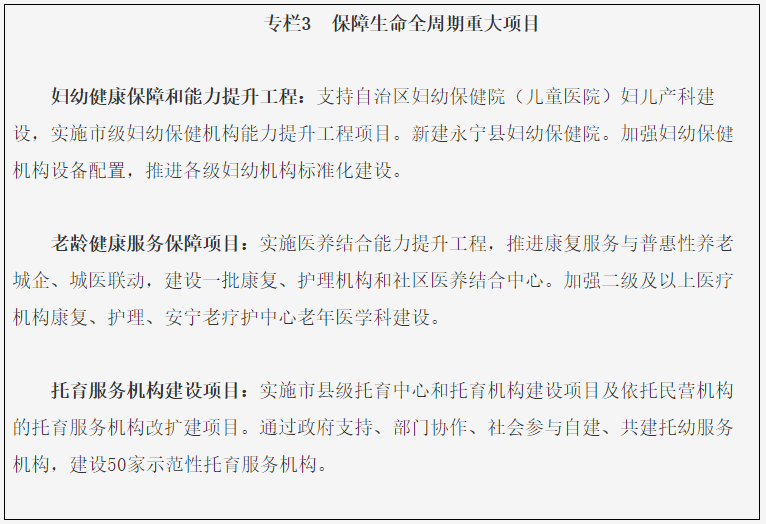 改造升级市级妇幼保健机构设施设备,新建永宁县保健院,推动妇幼保健机构达到国家建设基本标准。加强妇幼保健机构能力建设,推进妇幼保健机构标准化建设。加强综合医院产、儿科和儿童医院建设,提升妇幼健康服务能力。推进医养康养融合发展。实施社区医养结合能力提升工程。加强医疗卫生和养老服务衔接,探索开展“医养一体,两院融合,三中心合一”试点工作,推进敬老院(养老院、幸福院)与乡镇卫生院健康养老功能融合,城市社区卫生服务中心(站)与日间照料中心、康复中心医养一体服务。开展普惠托育服务。补齐托育服务短板,实施普惠托育服务专项行动,形成基本完善的婴幼儿托育服务网络,提供全日托、半日托、计时托、临时托等多样化的普惠托育服务,基本建立多元化、多样化、覆盖城乡的婴幼儿照护服务体系。
