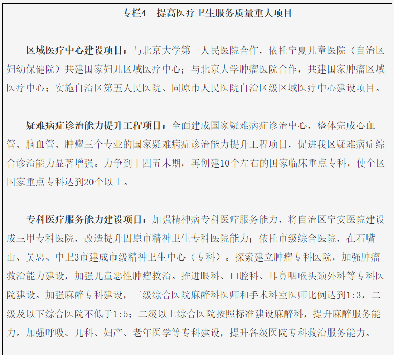 统筹区内外优质资源,提升建设速度,加快推进综合类国家区域医疗中心、自治区级医疗中心和癌症、心血管、儿科、妇产、呼吸和创伤等专科类国家区域医疗中心建设。到2025年,争取创建1个综合类别国家区域医疗中心,6-8个专科类别的国家区域医疗中心和1个“互联网+医疗健康”国家区域中心;建设5个综合类自治区级区域医疗中心和20个专科类自治区级区域医疗中心;宁夏医科大学总医院进入全国百强医院、自治区人民医院进入西部20强医院;区内向区外转诊人数每年下降5%以上;以市为单位,推进胸痛、卒中、创伤、危重孕产妇和危重新生儿救治中心、肿瘤和慢病中心建设,实现“七大中心”全区覆盖,慢病和心脑血管疾病筛查全面开展,全区急危重症救治能力进一步提升。