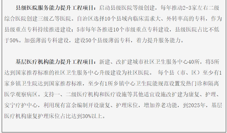 ——卫生健康服务能力明显提升。紧密型的县域医共体、区域医联体改革取得实效,基层普遍具备首诊分诊和健康守门能力,县域内人人就近享有便捷可及、系统连续的基本医疗卫生服务。区域医疗中心基本建立,覆盖自治区、市、县三级的胸痛、脑卒中、创伤、肿瘤、危重孕产妇救治、危重新生儿救治、健康管理中心基本建立,促进自治区内人人享有同质化的危急重症、疑难病症诊疗服务。健康服务智能化水平显著提升。老年医学中心(科)建设切实加强。全民医保制度进一步健全。县域内人人享有均等化的基本医疗卫生服务。