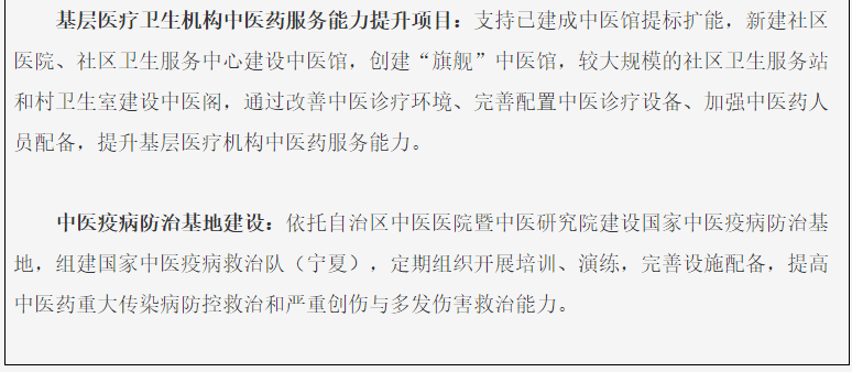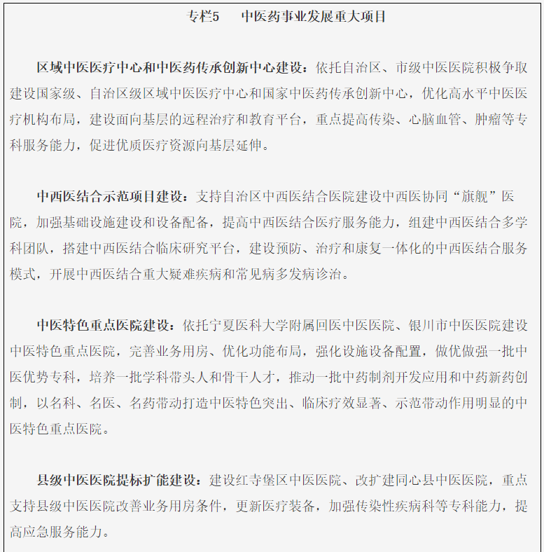 推进中医药传承创新发展。打造中医药和西医药相互补充协调发展的中国特色卫生健康发展模式,加强区域中医医疗中心建设,完成自治区、银川市中医医院中医药传承创新工程项目建设,建设国家中医疫病防治基地,建设2个中医特色重点医院,加强县级中医医院提标扩能建设,实施基层医疗卫生机构中医馆提档升级工程,县级综合医院设立标准化中医科和中药房,妇幼健康服务机构开展中医药服务。建设10-15个自治区中医重点专科(京宁中医药合作重点专科),向中医药基础类、经典类、应急类重点学科倾斜。实施“中医治未病工程升级版”,加强公立中医医院治未病中心建设。实施“中医药康复服务能力提升工程”,加强公立中医医院康复(医学)中心(科)建设,推广中医康复技术。实施中医养生保健行动。培养中医药临床人才、创新复合型人才、技术技能人才,实施“黄河名医”中医发展计划,实施中医药传承创新人才工程,加强高层次人才培养基地、重点学科(专科)、各级各类名老中医传承工作室等平台建设。促进中药饮片和中成药质量提升,推动经备案的中医药院内制剂在全区中医医疗卫生机构推广使用。