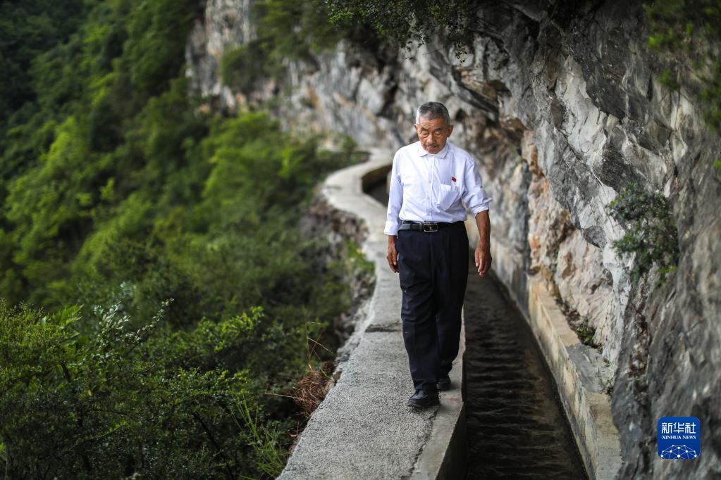黄大发沿着修建在绝壁上的“大发渠”巡查(2018年8月11日摄)。新华社记者 刘续 摄