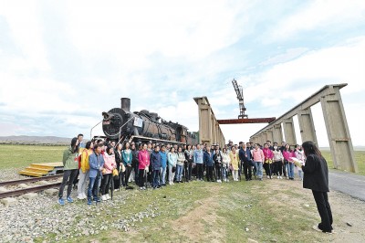 5月31日,青海大学“三江源生态”一流学科博士团成员在221厂旧址听“两弹一星”理想信念教育学院工作人员讲解党史。新华社发