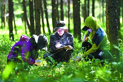 工作人员在河北塞罕坝机械林场采集数据。新华社发
