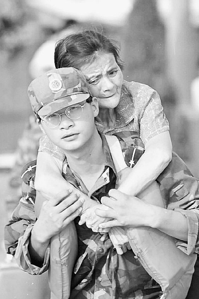 历史图片:1998年抗洪抢险一线,人民解放军及武警官兵顽强拼搏。左图为江西九江抗洪前线的解放军战士身背灾区群众向高处转移,曾刊发于本报1998年8月9日1版。图片为新华社记者拍摄/资料图片