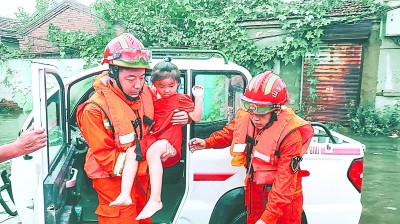 2020年8月,山东聊城遭遇暴雨袭击,高唐县和阳谷县城区多处积水,消防队员迅速赶赴受灾现场,紧急疏散营救被困群众。图为消防队员转移被困儿童。新华社发