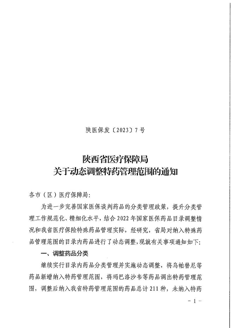 陕西省医疗保障局关于动态调整特药管理范围的通知