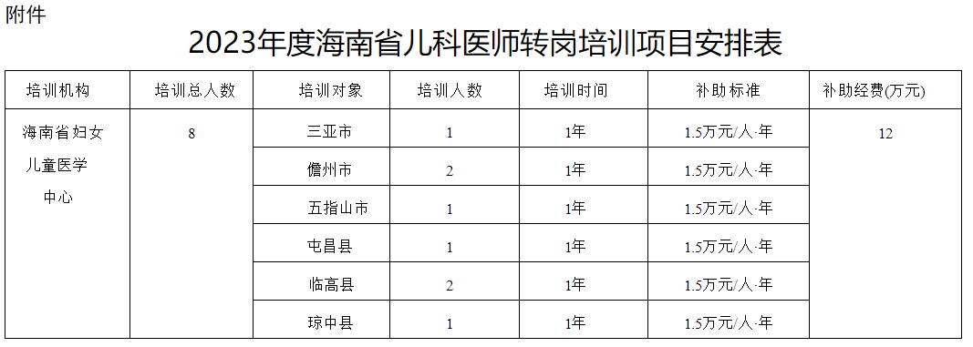 为进一步提高儿科医疗服务能力,缓解我省儿科专业医师短缺问题,根据财政部、国家卫生健康委、国家中医药局、国家疾控局《关于提前下达2023年医疗服务与保障能力提升(卫生健康人才培养)补助资金预算的通知》(财社〔2022〕136号)有关要求,我委制定了《2023年海南省儿科医师转岗培训实施方案》,现印发给你们,请认真组织实施。转岗培训后,省卫生健康委将委托培训机构组织考核,考核合格并符合相关条件的,可持《医师执业证书》到市县卫生健康委办理转岗儿科医师或增加儿科执业范围。请三亚市、儋州市、五指山市、屯昌县、临高县、琼中县卫生健康委根据方案中的2023年度海南省儿科医师转岗培训项目安排表确定选派转岗培训人员,并于2023年3月3日前将“选派参加2023年儿科医师转岗培训人员名单”(见附件)发送至海南省卫生健康委医政医管局邮箱。