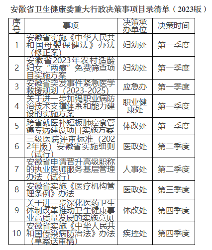 为规范重大行政决策程序,推进科学、民主、依法决策,根据《重大行政决策程序暂行条例》《安徽省重大行政决策程序规定》等规定,现将《安徽省卫生健康委重大行政决策事项目录清单(2023版)》印发给你们。请各决策事项承办处室严格对照有关要求,认真落实公众参与、专家论证、风险评估、公平竞争审查、合法性审查、集体讨论决定和决策公布等程序,确保内容合法、程序公开;要进一步完善重大行政决策过程记录和材料归档制度,严格落实重大行政决策责任追究制度;重大事项决策目录如需新增或调整,由决策事项承办处室按照规定程序办理。