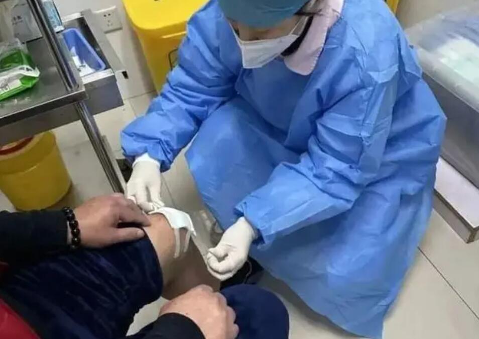原来,张老伯左膝盖由于贴暖宝宝时间过长,导致皮肤受伤来就诊。经换药室护士评估为左膝盖低温烫伤,表面白膜覆盖,有少量渗出液,已经两月有余。由于张老伯有糖尿病史,而且年龄比较大,伤口愈合的各方面都比较困难,对此,护理团队立即与上级医院专家联合会诊,邀请护理专家现场指导,为张老伯制定了有效的治疗方案。