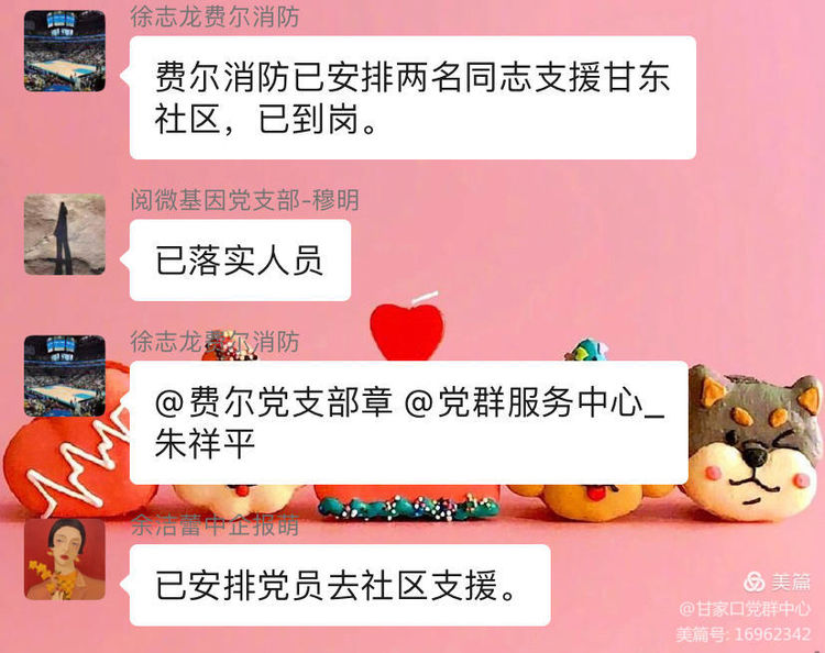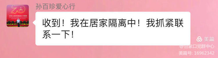 正在居家隔离的爱心行党支部书记孙百珍、阳光新锐党支部书记焦正辉以及外地出差的费尔消防党支部书记章兴忠心系街道的防疫工作,虽然不能亲自到场,但是第一时间安排支部党员支援社区。