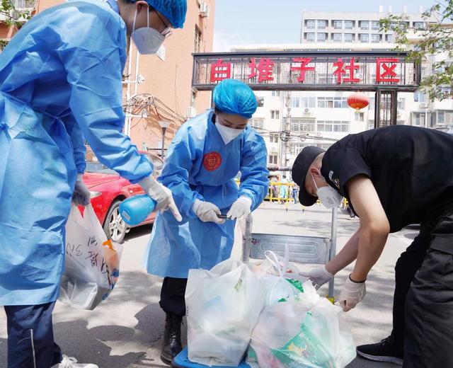 因有确诊病例,4月30日起,海淀区甘家口街道的12个社区被划入临时管控范围。为了最大程度避免外卖快递小哥与管控区居民直接接触、靠近管控区造成“弹窗”等问题,多个小区门口设起了缓冲区,由志愿者们接力消杀、传递物资,为居民和外界之间架起一道“安全桥”。