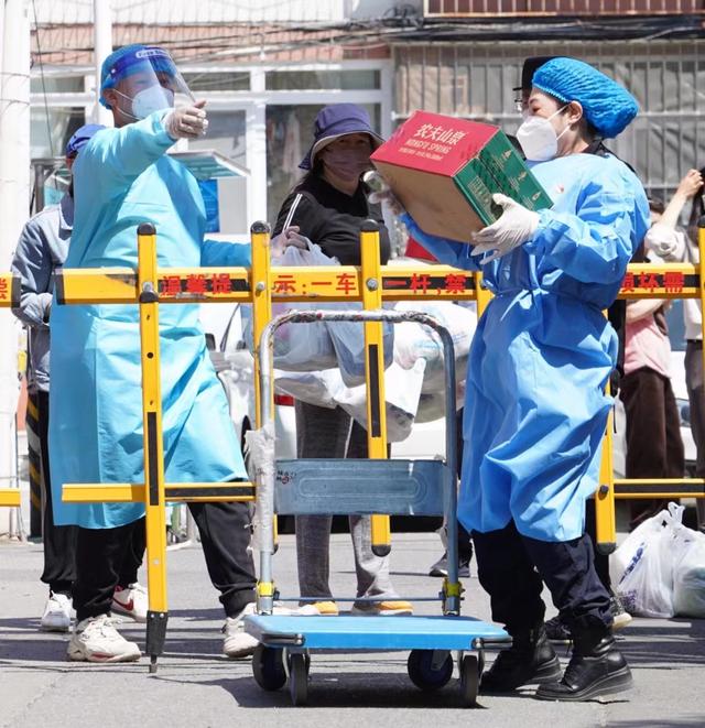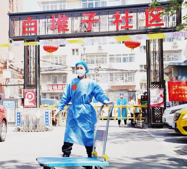 5月1日上午,在甘家口街道白堆子小区南门外,拉起了警戒线,不时有管控区的居民到南门内侧取快递。距离南门10米处的马路边,也拉起了另一道线。“阜成路北11号楼,是这儿,给我吧!”与停靠线外的一位快递小哥确定订单地址后,志愿者王晓斌接过物资,传递给缓冲区的另一位志愿者孟岩,消杀后,孟岩再用小推车运送到南门里,交给管控区里的志愿者。志愿者们口罩、帽子、医用防护服“全副武装”,不断来回运输物资。