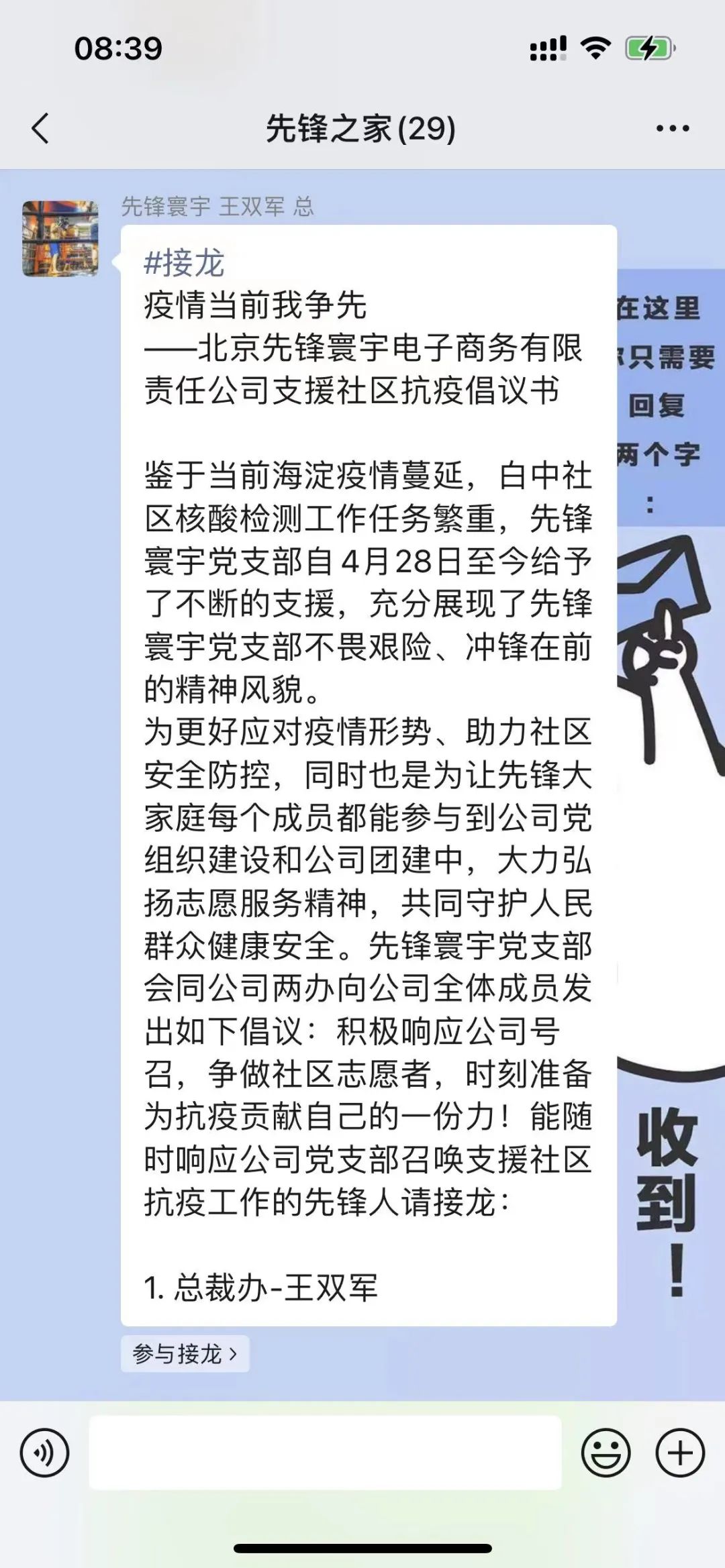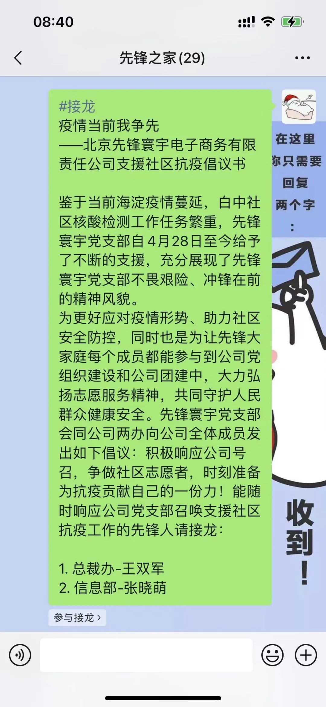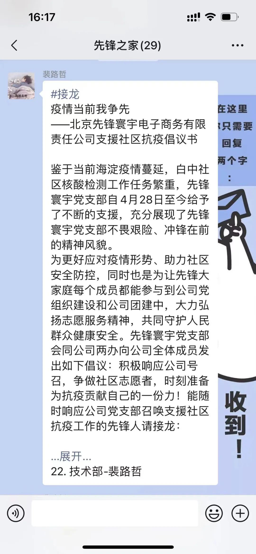 随着海淀区疫情防控形式日趋严峻,先锋寰宇党支部“先锋志愿队”持续支援白中社区核酸筛查将近一个月,人员疲惫,又因多名成员居住小区被封控不能外出,导致志愿队伍减员!为继续支持白中社区抗疫,5月24日晚18点,先锋寰宇党支部面向公司全员吹响“集结号”:以接龙形式号召大家积极响应社会抗疫需求,争做社区志愿者,时刻准备为抗疫贡献自己的一份力量!
