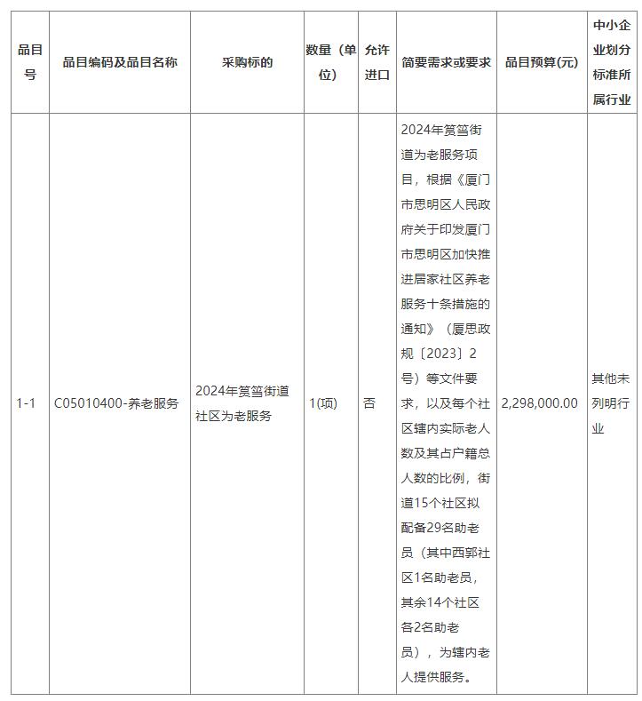 受厦门市思明区人民政府筼筜街道办事处委托,大成工程咨询有限公司对[350203]DCGC[GK]2024001、2024年筼筜街道社区为老服务组织公开招标,现欢迎国内合格的供应商前来参加。2024年筼筜街道社区为老服务的潜在投标人应在福建省政府采购网(zfcg.czt.fujian.gov.cn)免费申请账号在福建省政府采购网上公开信息系统按项目获取采购文件,并于2024年03月11日 09时15分00秒(北京时间)前递交投标文件。