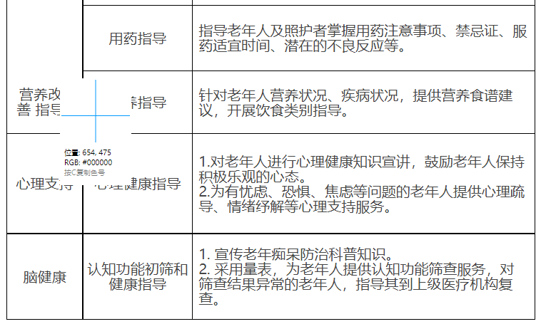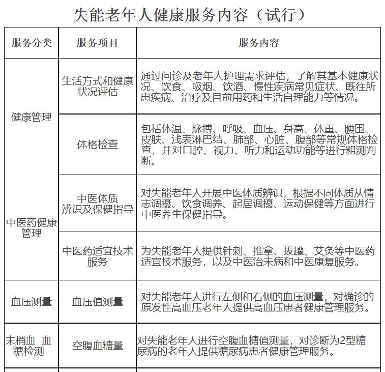 每年为失能老年人提供1次生活方式和健康状况评估、体格检查、中医体质辨识及保健指导等服务,并根据老年人体质从情志调摄、饮食调养、起居调摄、运动保健、穴位保健等方面进行中医养生保健指导。各地结合实际,为提出申请的老年人进行失能状况评估,每年上门为失能老年人提供不少于2次血压测量、末梢血血糖检测、康复指导、护理技能指导、营养改善指导、心理支持等服务。鼓励中医师积极参与家庭医生签约服务,为失能老年人提供针刺、推拿、拔罐、艾灸等中医药适宜技术服务,以及中医治未病和中医康复服务。有条件的地方继续开展老年人认知功能初筛服务,对筛查结果异常的老年人,指导其到上级医疗机构复查及诊治。