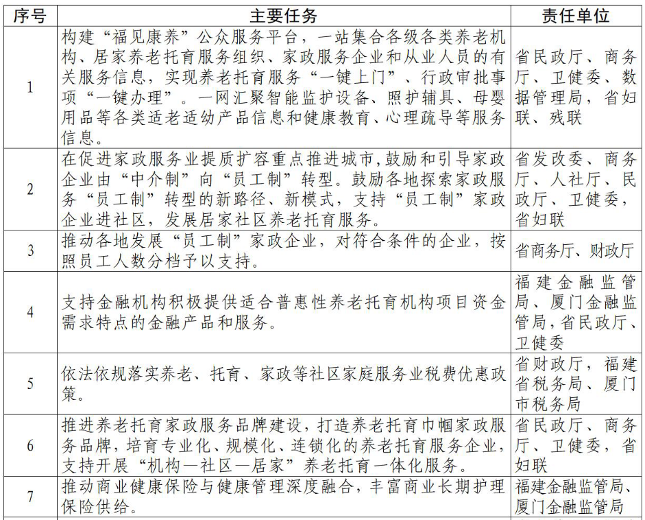 各设区市和平潭综合实验区要以健全政策体系、扩大服务供给、打造发展环境、完善监管服务为着力点,促进养老托育服务体系健康发展。要发挥好促进家政服务业提质扩容联席会议制度作用,各相关部门要对照任务清单(详见附件)协调配合,大力推进“一老一小”家政服务发展,切实形成工作合力。