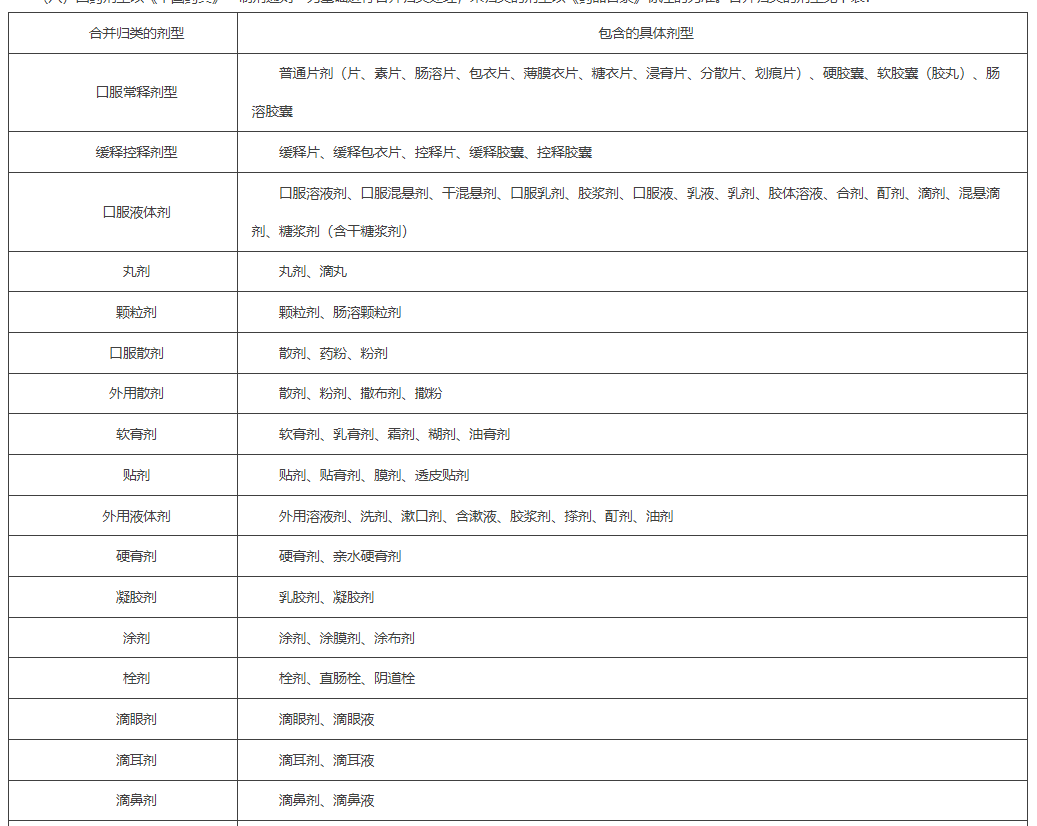 (八)西药剂型以《中国药典》“制剂通则”为基础进行合并归类处理,未归类的剂型以《药品目录》标注的为准。合并归类的剂型见下表: