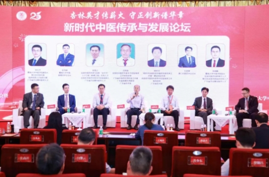 建院25周年庆祝大会结束后举办传承发展论坛圆桌对话,沈英森、朱晓峰、杨钦河、张竞之、石崇荣、区浩庭、刘红杰围绕“新时代中医传承与发展”主题开展讨论与分享。