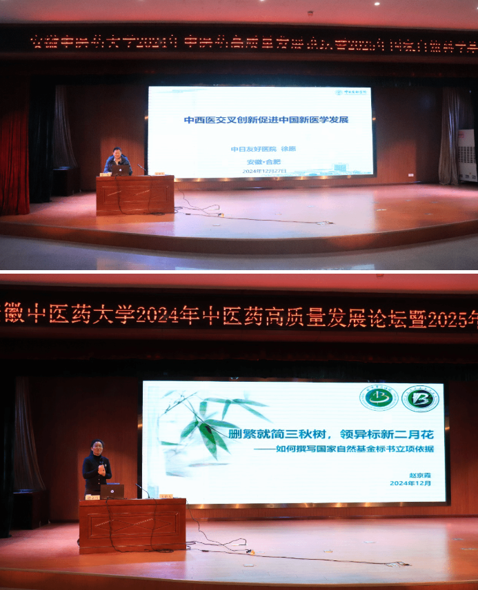 2024年12月27日下午,由安徽中医药大学药学院、科技处主办,教育部省部共建安徽道地中药材品质提升协同创新中心、安徽省道地中药材品质提升与开发利用工程研究中心、安徽省现代中药产业共性技术研究中心协办的2024年中医药高质量发展论坛暨2025年国家自然科学基金指导成功举办。本次讲座主讲人为中日友好医院国家中西医结合医学中心事务委员会综合办公室副主任徐愿主任医师、首都医科大学附属北京中医医院北京市中医药研究所所长助理赵京霞教授和三峡大学基础医学院执行院长赵海霞教授。讲座由学校党委常委、副校长、药学院院长桂双英主持,学校及附院的部分老师与研究生参加了会议。