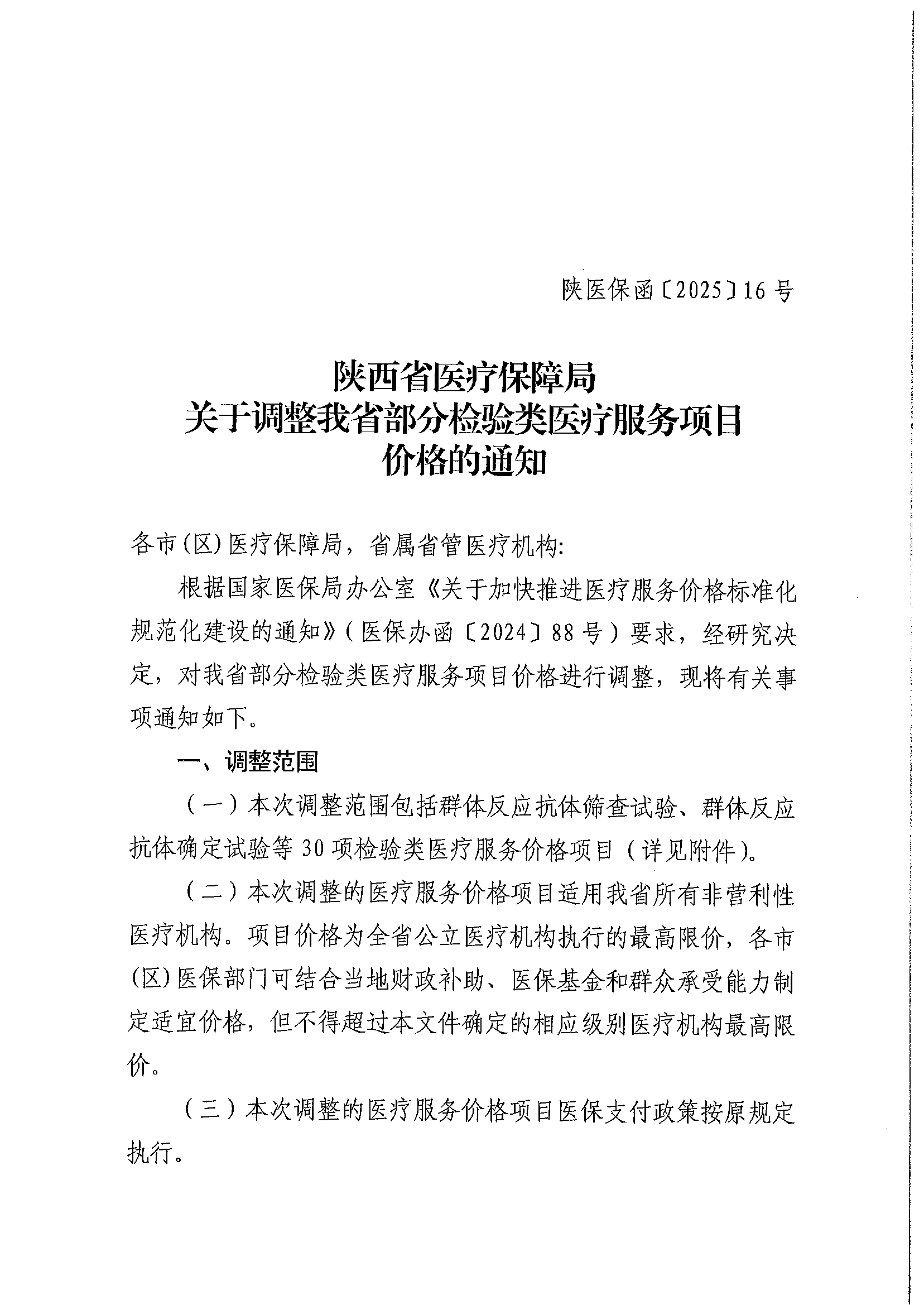 陕西省医疗保障局关于调整我省部分检验类医疗服务项目价格的通知