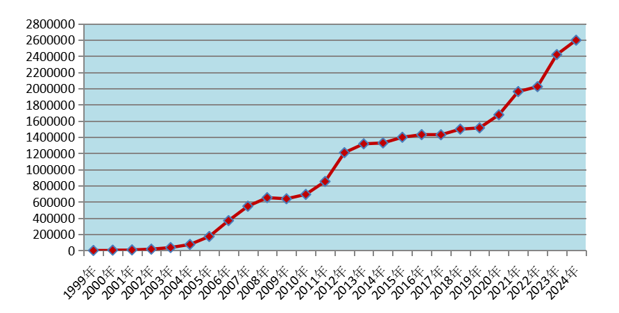 图1 1999年-2024年全国药品不良反应/事件报告数量增长趋势
