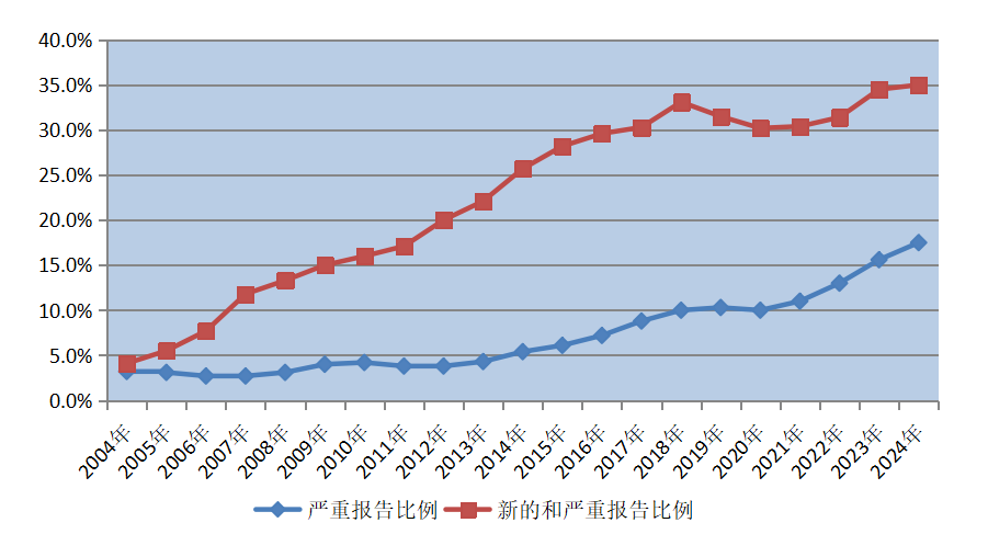 图2 2004年-2024年新的和严重以及严重药品不良反应/事件报告比例