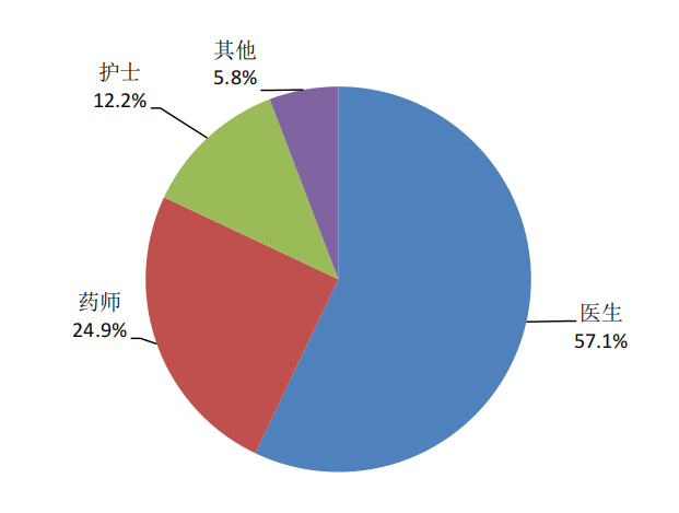 按照报告人职业统计,医生占57.1%、药师占24.9%、护士占12.2%、其他职业占5.8%(图4)。