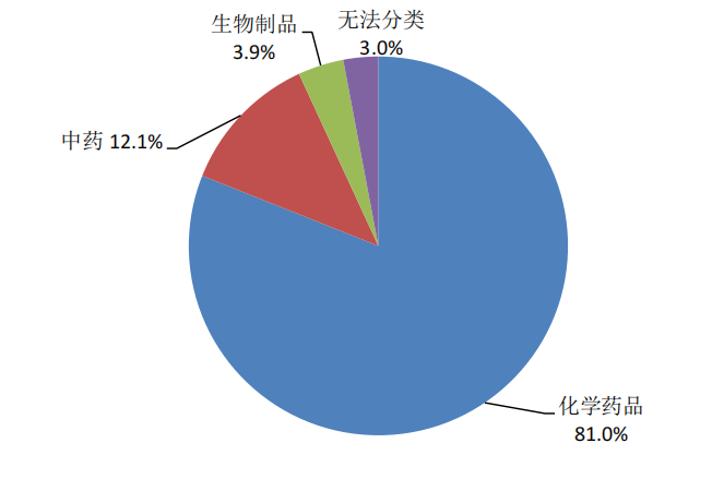 按照怀疑药品类别统计,化学药品占81.0%、中药占12.1%、生物制品占3.9%、无法分类占3.0%(图6)。