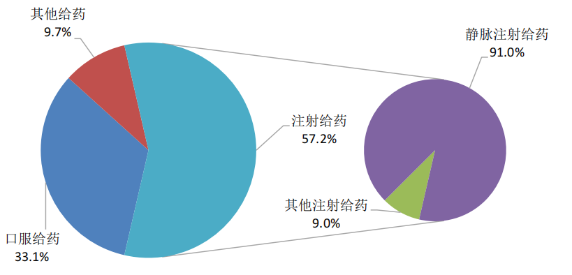 按照给药途径统计,2024年药品不良反应/事件报告中,注射给药占57.2%、口服给药占33.1%、其他给药途径占9.7%;注射给药中,静脉注射给药占91.0%、其他注射给药占9.0%(图7)。