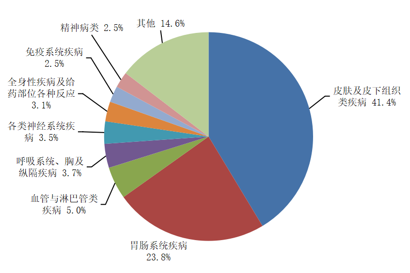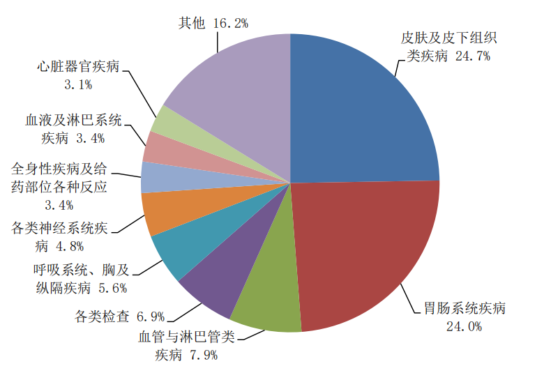 2024年报告的药品不良反应/事件中,累及器官系统排名前3位依次为皮肤及皮下组织类疾病、胃肠系统疾病、血管与淋巴管类疾病(图8)。