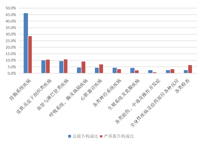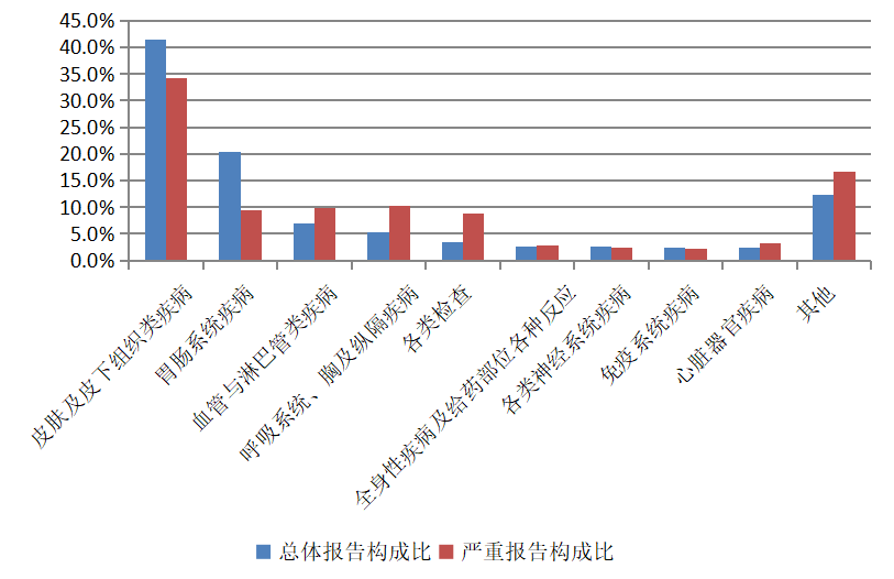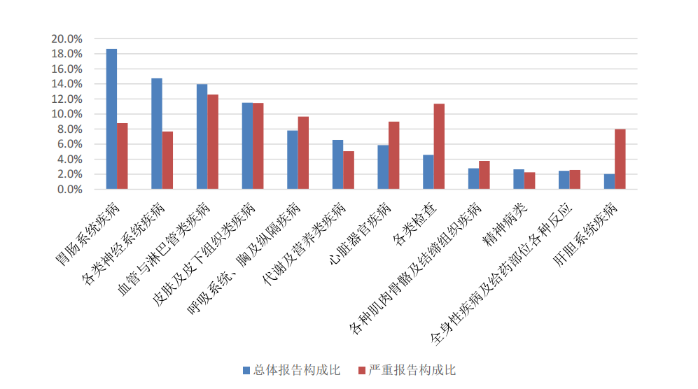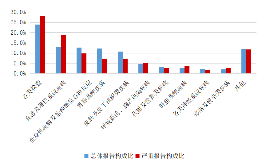 2024年生物制品抗肿瘤药不良反应/事件报告中,总体报告和严重报告的药品不良反应/事件累及器官系统情况详见图13。与生物制品抗肿瘤药的总体报告相比,严重报告的各类检查、血液及淋巴系统疾病构成比偏高。