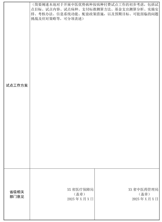 各省级医保部门会同中医药主管部门按照要求组织开展试点遴选申报工作,可以省或地市为单位申报试点。原则上每个省份不超过1个试点,以省为单位申报试点的,全省需统一中医优势病种目录。书面申报材料经省级医保部门和中医药主管部门审核同意后,于2025年10月31日前同时报送至国家医疗保障局和国家中医药管理局。国家医疗保障局和国家中医药管理局组织专家研究确定试点名单,并指导做好试点工作。