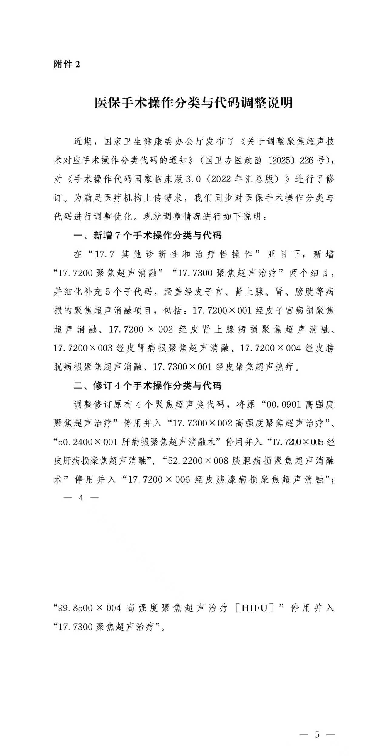 近期,国家卫生健康委办公厅发布《关于调整聚焦超声技术对应手术操作分类代码的通知》(国卫办医政函〔2025〕226号),对《手术操作代码国家临床版30(2022年汇总版)》进行了修订。