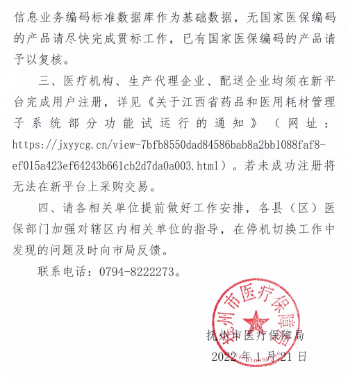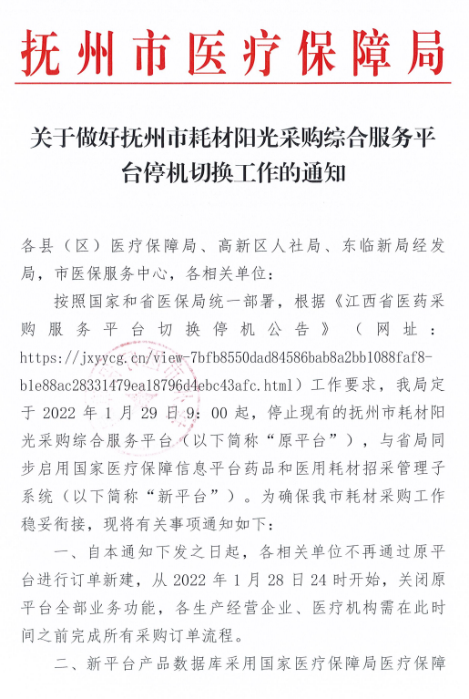 关于做好抚州市耗材阳光采购综合服务平台停机切换工作的通知