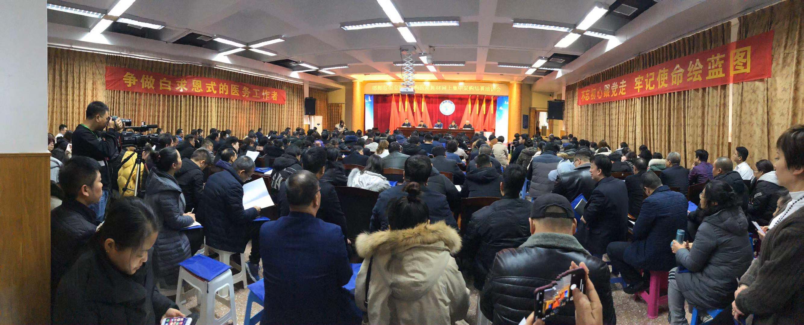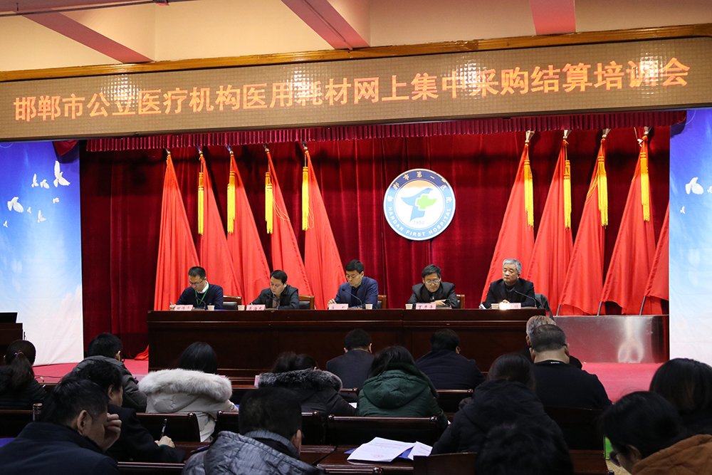 2019年12月20日下午,邯郸市医保局组织召开了全市二级及以上公立医疗机构医用耗材网上集中采购结算培训大会,旨为推动市医疗机构医用耗材采购集中网上交易结算工作,提高采购工作效率,规范采购行为,提升医用耗材流通领域结算规范化、专业化、信息化水平,进一步深化邯郸市医疗保障改革。邯郸市医保局副局长李彪、医药价格和招标采购处负责人吴海龙、药品耗材使用管控组负责人丁彦平、基金审核和规划财务处杜晓艳出席会议。