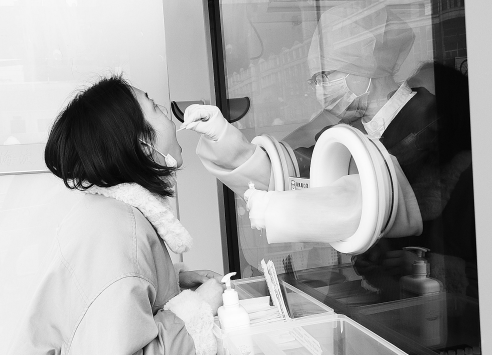 检测者在微信小程序上预约开单、缴费后,到户外的核酸检测点进行检测。海淀妇幼/供图