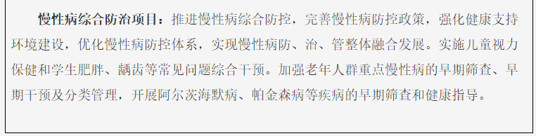 完善公共卫生服务项目。实施国家基本公共卫生服务项目和重大公共卫生服务项目,持续巩固和扩大服务面、优化服务内涵、提高防治结合和健康管理服务水平。继续抓实国家免疫规划,强化慢性病预防、早期筛查和综合干预。加强城乡社区慢病医防融合,推进基本公共卫生服务均等化、项目制度化。鼓励市、县结合实际把受群众欢迎、与基层能力相适应、服务获得感强的项目纳入地方公共卫生服务项目。