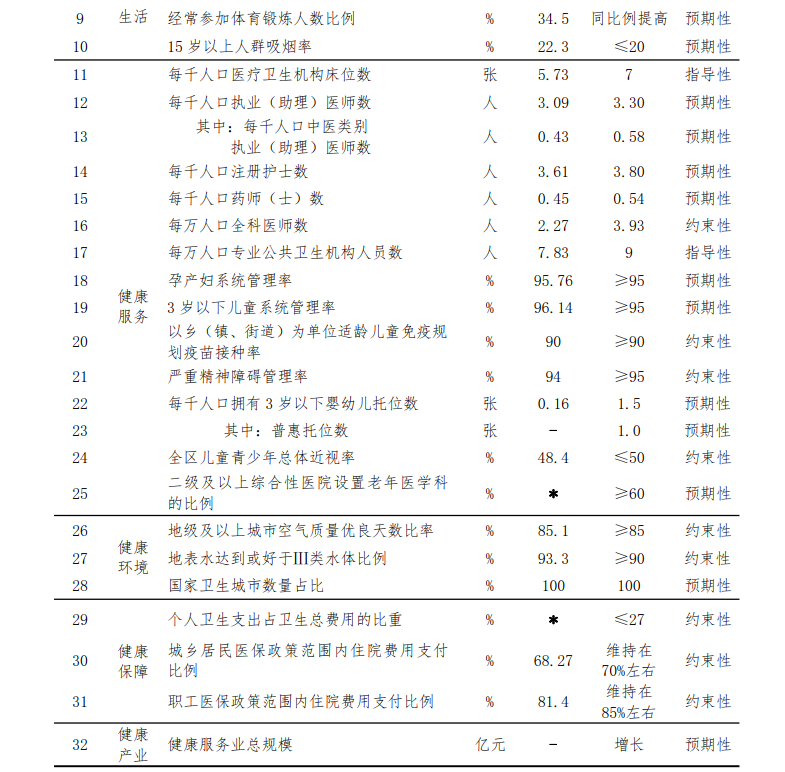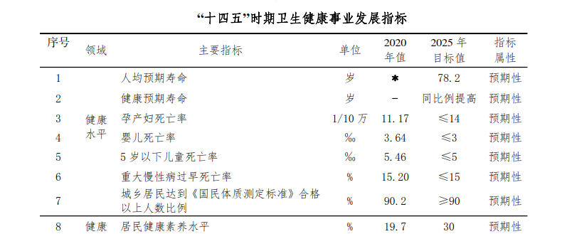 ——全民健康水平得到明显提升。体系完整、分工明确、功能互补、密切协作、运行高效的整合型医疗卫生服务体系基本建成,以“一老一小”为重点的全周期健康服务能力明显增强,综合连续的老年健康服务体系基本构建,婴幼儿照护服务供给有效增加,从生命全周期、健康全过程维护和保障人民健康。全民健康素养水平明显提高,健康生活方式得到全面普及。有利于健康的生产生活方式基本形成,居民自我健康管理能力明显提高。