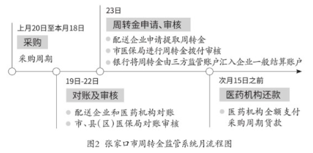 在集中采购药品货款的直接结算中,各方主体按照时间进度履行相应职责,规范周转金监管系统操作流程(其中,月流程图见图2)。