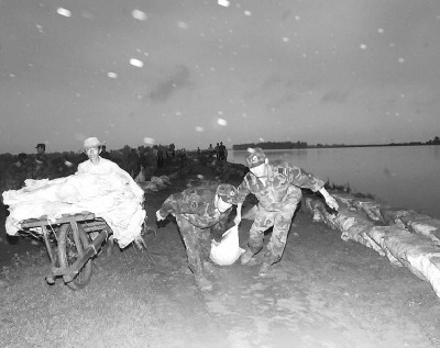 湖北武汉抗洪前线军民奋战在洪水漫溢的路段,曾刊发于本报1998年7月24日1版。图片为新华社记者拍摄/资料图片