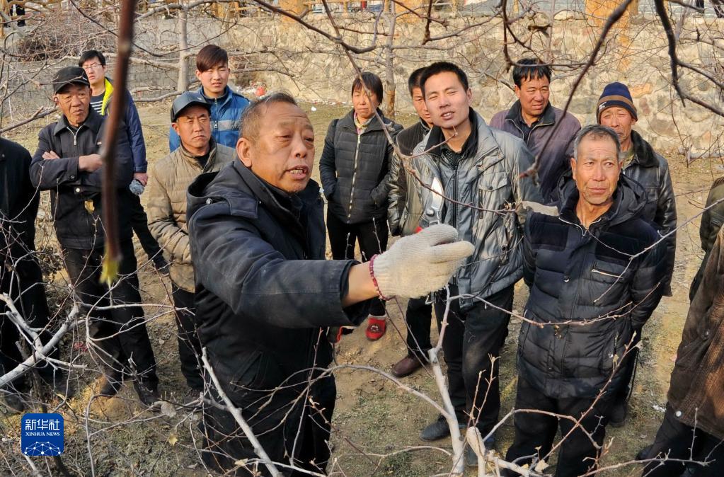 李保国(前左)在河北省内丘县岗底村向村民讲解果树修剪知识(2016年1月27日摄)。新华社记者 朱旭东 摄