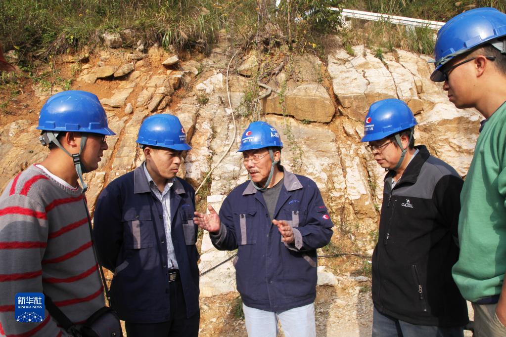 南仁东(中)与工程技术人员在大窝凼施工现场检查施工进展(2014年12月1日摄)。新华社发(中科院国家天文台供图)