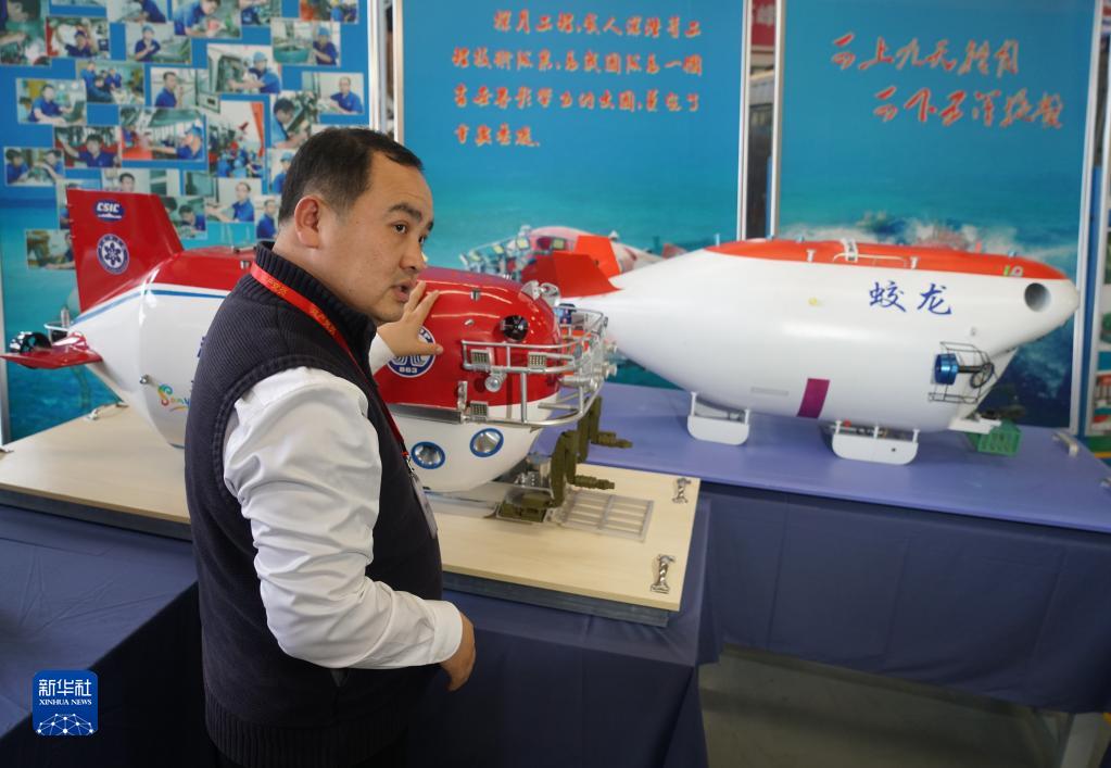 在中船重工第七〇二研究所,叶聪在“蛟龙号”“深海勇士”号模型前介绍情况(2018年12月24日摄)。新华社记者 季春鹏 摄