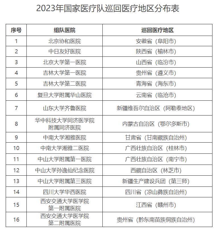 各医院按照2023年国家医疗队巡回医疗地区分布表(附件)派出国家医疗队,重点开展以下工作: